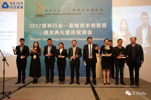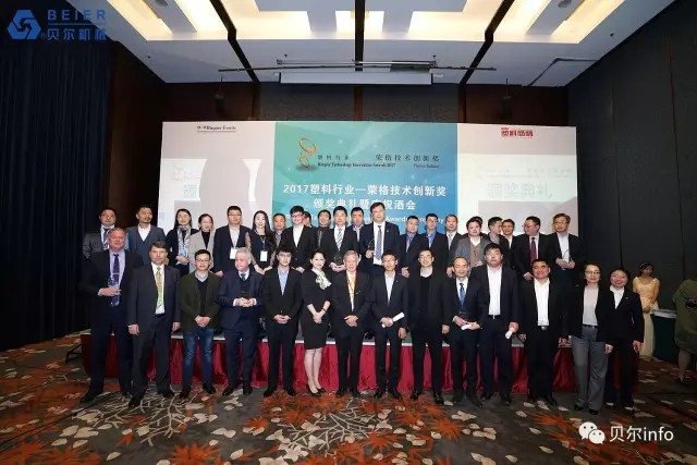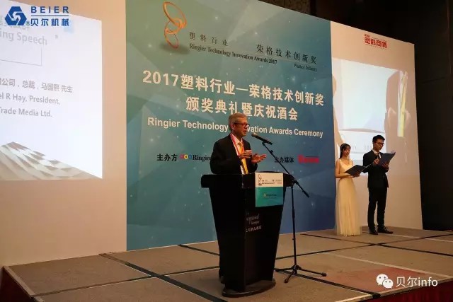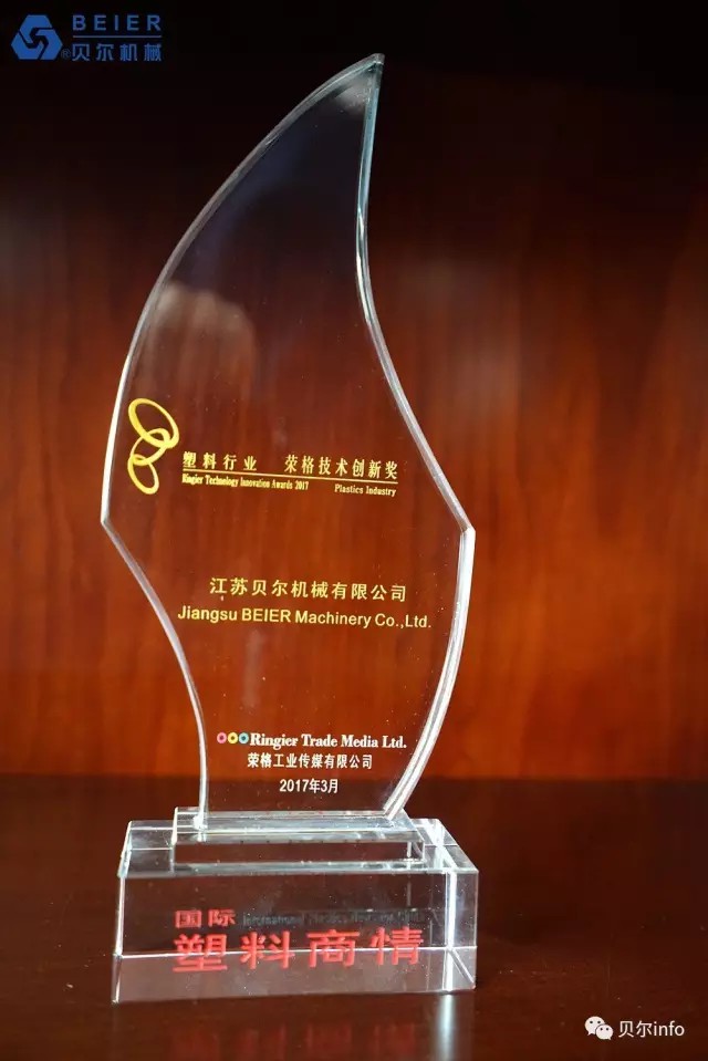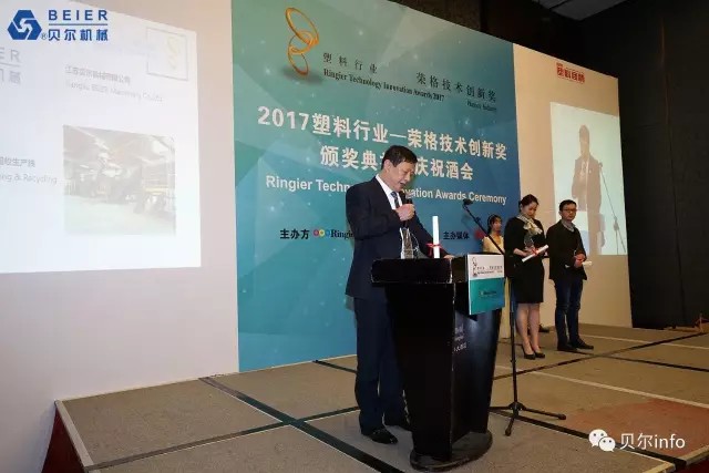 江蘇貝爾機械6000KG/H PET清洗回收生產線榮獲 2017榮格技術創新獎。榮格工業傳媒總裁馬國熙先生致辭時提到的:"今年所有的獲獎產品都是實至名歸,有些技術成功填補了國內市場的空白;有些技術極大優化了傳統加工工藝技術,從而表現得更加節能和高效;還有些技術在高性能和環保方面有杰出表現……所有的獲獎產品都是優中選優,而且今年的報名產品尤為注重在具體應用領域的創新"。