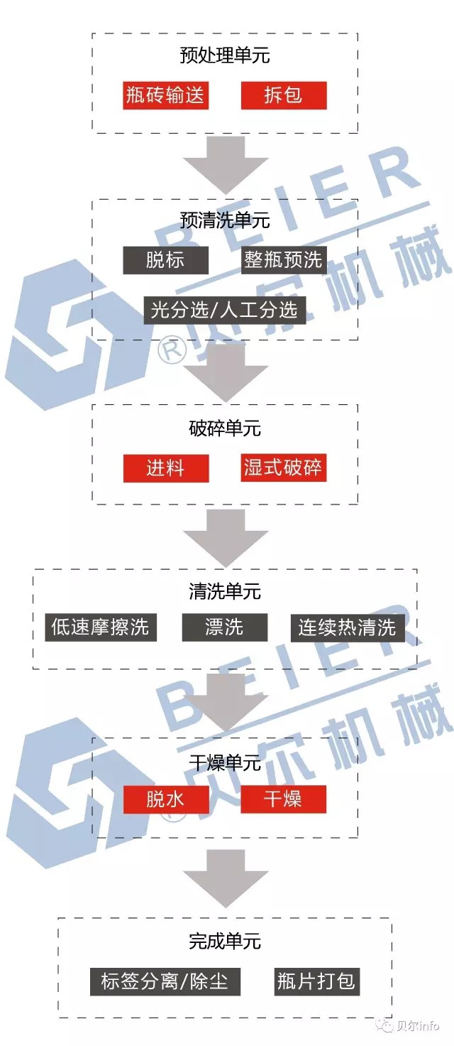 回收的PET塑料瓶,首先經過"脫標機"去除瓶身的標簽,然后經過"平面分選輸送機",在此步驟挑選出物料中的雜色瓶(如綠色瓶、藍色瓶、殘余雜質等),再進入"破碎機"進行粉碎,出來后進入"漂洗水槽"進行分離(實現PET瓶片與PP標簽紙、瓶蓋的分離),分離干凈后進入"熱清洗單元"進行加熱清洗,出來后再進入"漂洗水槽"進行漂洗(去除高溫加熱中的清洗劑),最后進入"脫水機"脫水后直接裝包。針對產量大、瓶片級別高我們可通過整瓶預洗環節、脫標分揀環節、初碎環節、初洗分離環節、高溫清洗環節、中和清洗環節、漂洗干燥環節、瓶片精選環節等整套精洗環節來達到高精凈片。此流程為常規流程,亦可根據客戶需要設計不同生產解決方案。
