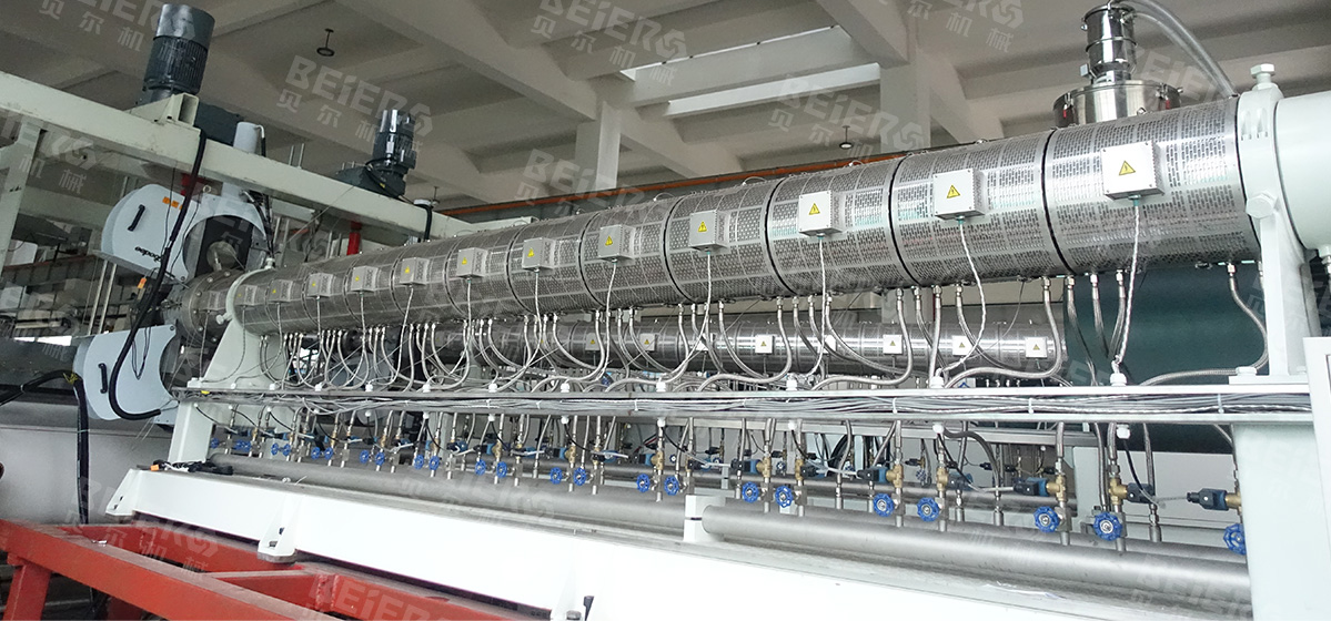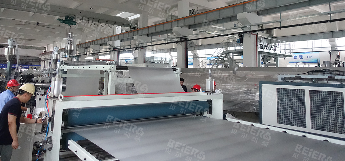 光伏EVA膠膜自動化生產線包括混料,擠出,流延,壓花,輸送,分切,收卷等工序。同時還具備前道儲料時輸送,后道廢料造粒回收等生產線。